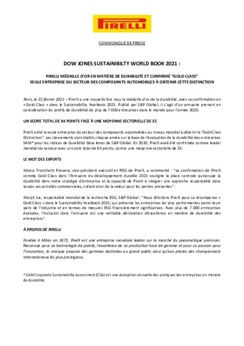 Pirelli a une nouvelle fois reçu la médaille d'or de la durabilité, avec sa confirmation en " Gold Class " dans le Sustainability Yearbook 2021. Publié par S&P Global, il s'agit d'un annuaire prenant en considération les profils de durabilité de plus de 7 000 entreprises dans le monde pour l'année 2020.