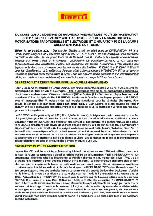 Pirelli propose des équipements d'origine sur mesure pour les icônes de cette tradition : P ZERO et P ZERO Elect pour les GranTurismo et GranTurismo Folgore, ainsi qu'un nouveau CINTURATO™ P7 de la gamme Collezione pour les collectionneurs de Biturbo. Tous ces pneumatiques bénéficient d'un développement dédié, en collaboration avec Maserati, comme l'indique le marquage MGT sur leurs flancs.