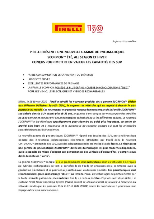 Pirelli a dévoilé ce matin lors d'une conférence de presse digitale les nouveaux produits de sa gamme SCORPION dédiée aux Véhicules Utilitaires Sportifs (SUV), le segment de véhicules qui est appelé à devenir le plus populaire au monde. Ces nouveautés marquent le renouvellement complet de la Famille Scorpion spécialisée dans le SUV depuis plus de 35 ans, la gamme étant conçue sur mesure pour des modèles haut de gamme et comportant des pneumatiques spécialisés pour les différentes saisons...