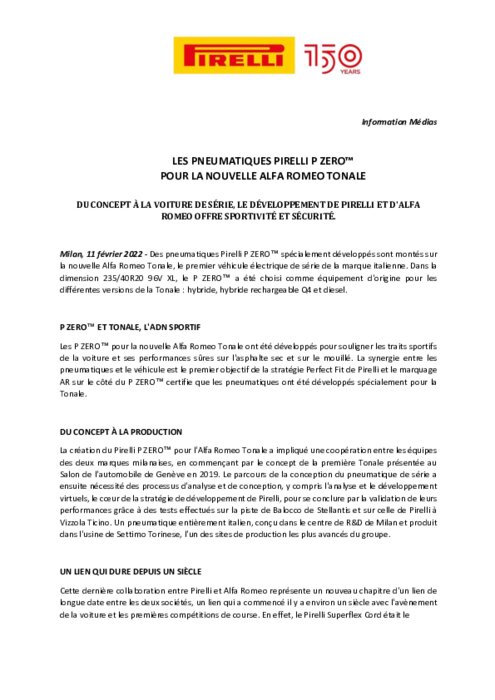 Des pneumatiques Pirelli P ZERO spécialement développés sont montés sur la nouvelle Alfa Romeo Tonale, le premier véhicule électrique de série de la marque italienne. Dans la dimension 235/40R20 96V XL, le P ZERO a été choisi comme équipement d'origine pour les différentes versions de la Tonale : hybride, hybride rechargeable Q4 et diesel