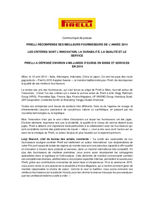 Italie, Allemagne, Indonésie, Chine et Japon. Ce sont les pays des neufs gagnants du « Pirelli’s 2015 Supplier Awards », la manière traditionnelle pour Pirelli de récompenser la qualité de ses meilleurs fournisseurs.