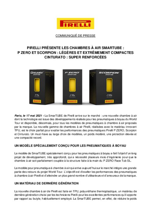 La SmarTUBE de Pirelli arrive sur le marché : une nouvelle chambre à air dont la technologie est issue des développements réalisés pour les pneumatiques à boyau du World Tour et disponible, désormais, pour tous les modèles de pneumatiques à chambre à air proposés par la marque. La nouvelle gamme de chambres à air Pirelli, réalisée avec le matériau innovant TPU, est le choix parfait pour exalter les performances des pneumatiques Pirelli P ZERO, Scorpion et Cinturato...