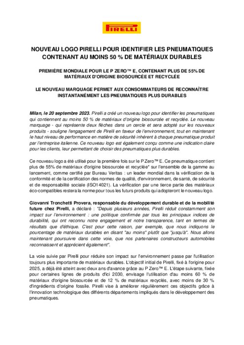 Le nouveau marquage - qui représente deux flèches dans un cercle et sera adopté sur les nouveaux produits - souligne l'engagement de Pirelli en faveur de l'environnement, tout en maintenant le haut niveau de performance en matière de sécurité inhérent à chaque pneumatique produit par l'entreprise italienne.