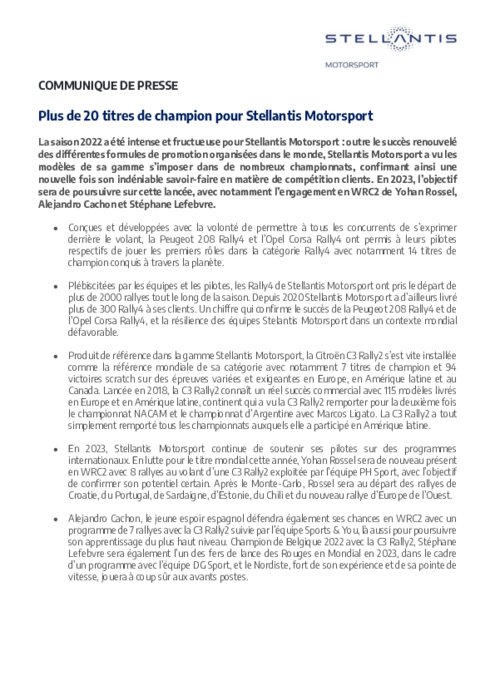 La saison 2022 a été intense et fructueuse pour Stellantis Motorsport : outre le succès renouvelé des différentes formules de promotion organisées dans le monde, Stellantis Motorsport a vu les modèles de sa gamme s’imposer dans de nombreux championnats, confirmant ainsi une nouvelle fois son indéniable savoir-faire en matière de compétition clients. En 2023, l’objectif sera de poursuivre sur cette lancée, avec notamment l’engagement en WRC2 de Yohan Rossel, Alejandro Cachon et Stéphane Lefebvre.