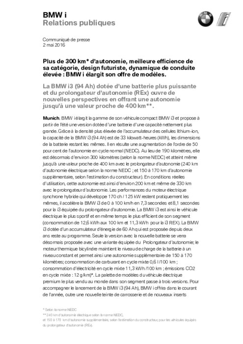 BMW i élargit la gamme de son véhicule compact BMW i3 et propose à partir de l’été une version dotée d’une batterie d’une capacité nettement plus grande. Grâce à la densité plus élevée de l’accumulateur des cellules lithium-ion, la capacité de la BMW i3 (94 Ah) est de 33 kilowatt-heures (kWh), les dimensions de la batterie restant les mêmes. Il en résulte une augmentation de l’ordre de 50 pour cent de l’autonomie en cycle normal (NEDC).