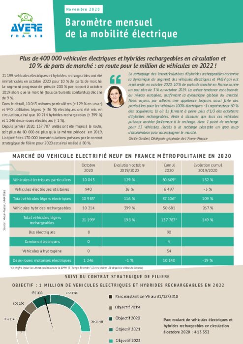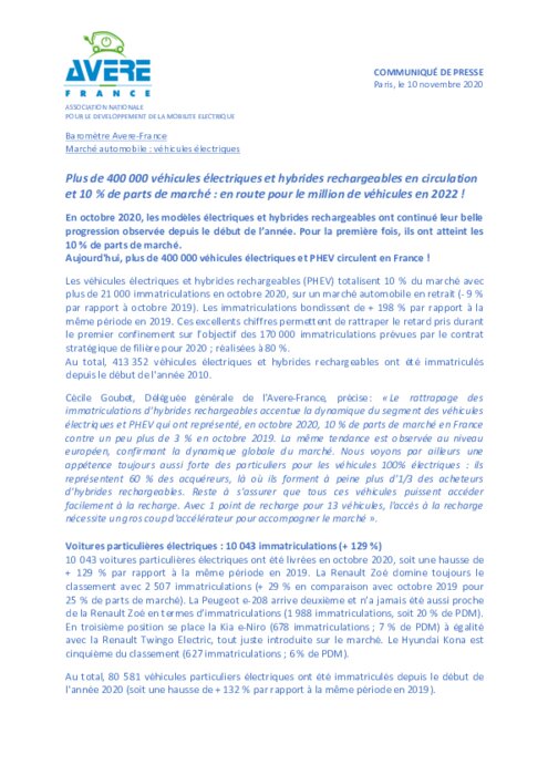 En octobre 2020, les modèles électriques et hybrides rechargeables ont continué leur belle progression observée depuis le début de l'année. Pour la première fois, ils ont atteint les 10 % de parts de marché. Aujourd'hui, plus de 400 000 véhicules électriques et PHEV circulent en France !