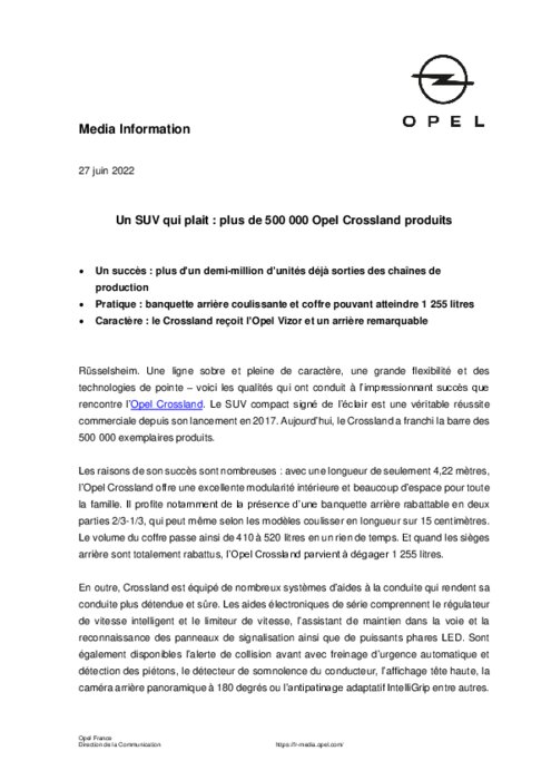 Une ligne sobre et pleine de caractère, une grande flexibilité et des technologies de pointe – voici les qualités qui ont conduit à l’impressionnant succès que rencontre l’Opel Crossland. Le SUV compact signé de l’éclair est une véritable réussite commerciale depuis son lancement en 2017. Aujourd’hui, le Crossland a franchi la barre des 500 000 exemplaires produits.