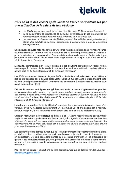 Une nouvelle enquête nationale, commandée par Tjekvik, spécialiste des solutions digitales pour l’après-vente, révèle que 71 % des clients seraient disposés à recevoir une estimation de leur véhicule actuel lorsqu’ils déposent leur véhicule pour un entretien ou une réparation. Ces résultats mettent en lumière le rôle important que peut jouer le département après-vente dans le développement de nouvelles opportunités commerciales pour les ventes de véhicules neufs et d'occasion.