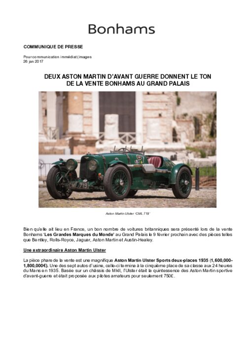 Bien qu’elle ait lieu en France, un bon nombre de voitures britanniques sera présenté lors de la vente Bonhams ‘Les Grandes Marques du Monde’ au Grand Palais le 9 février prochain avec des pièces telles que Bentley, Rolls-Royce, Jaguar, Aston Martin et Austin-Healey.