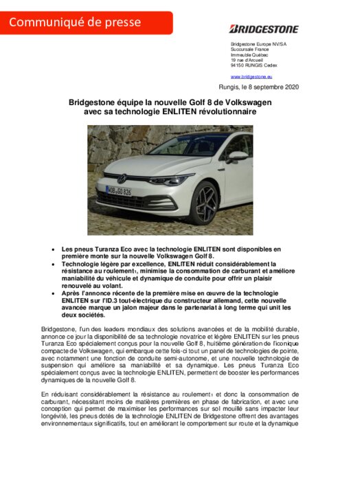 Bridgestone, l’un des leaders mondiaux des solutions avancées et de la mobilité durable, annonce la disponibilité de sa technologie novatrice et légère ENLITEN sur les pneus Turanza Eco spécialement conçus pour la nouvelle Golf 8, huitième génération de l’iconique compacte de Volkswagen, qui embarque cette fois-ci tout un panel de technologies de pointe, avec notamment une fonction de conduite semi-autonome, et une nouvelle technologie de suspension qui améliore sa maniabilité...