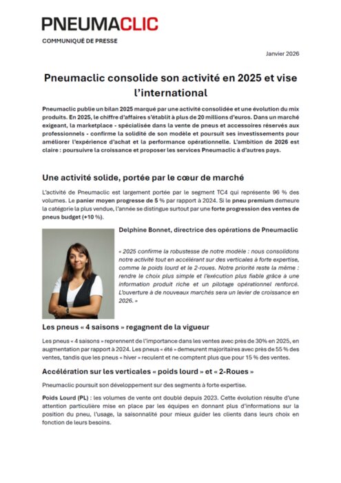 Pneumaclic publie un bilan 2025 marqué par une activité consolidée et une évolution du mix produits. En 2025, le chiffre d'affaires s'établit à plus de 20 M€. Dans un marché exigeant, la marketplace - spécialisée dans la vente de pneus et accessoires réservés aux professionnels - confirme la solidité de son modèle et poursuit ses investissements pour améliorer l'expérience d'achat et la performance opérationnelle. L'ambition de 2026 est claire : poursuivre la croissance et proposer les services Pneumaclic à d'autres pays.