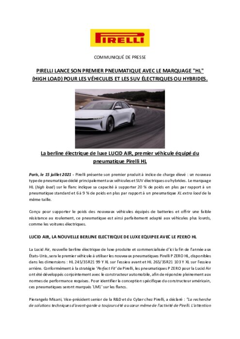 Pirelli présente son premier produit à indice de charge élevé : un nouveau type de pneumatique dédié principalement aux véhicules et SUV électriques ou hybrides. Le marquage HL (high load) sur le flanc indique sa capacité à supporter 20 % de poids en plus par rapport à un pneumatique standard et 6 à 9 % de poids en plus par rapport à un pneumatique XL extra load de la même taille.
