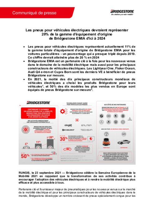 Les pneus pour véhicules électriques représentent actuellement 11% de la gamme totale d'équipement d'origine de Bridgestone EMIA pour les voitures particulières - un pourcentage qui a presque triplé depuis 2019. Ce chiffre devrait atteindre plus de 20 % en 2024. Bridgestone EMIA est un partenaire clé à la fois pour les nouveaux venus dans le domaine de la mobilité électrique mais aussi pour les principaux constructeurs de véhicules électriques.