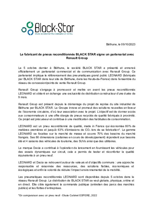 La société productrice de pneus reconditionnés a annoncé officiellement un partenariat commercial et de communication avec Renault Group. Ce partenariat implique le référencement des pneumatiques grand public LEONARD (fabriqués par BLACK STAR dans leur site de Béthune, dans les Hauts-de-France) dans l’ensemble du réseau de concession/points de vente Renault Group