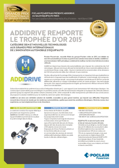 ADDIDRIVE remporte le TROPHEE D’OR 2015 catégorie OEM et nouvelles technologies aux grands prix internationaux de l'innovation automobile D'EQUIP'AUTO. Poclain Powertrain, nouvelle fliale du groupe Poclain créée en 2013, est dédiée au marché automobile par la mise au point d’une solution innovante et inédite, AddiDrive : une transmission 4x4 hydraulique combinant le meilleur du 4x2 et du 4x4 dans le même véhicule.