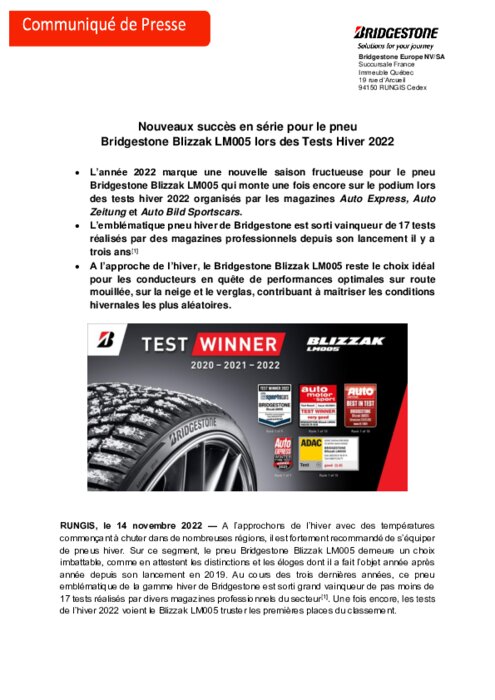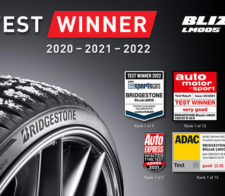 L’année 2022 marque une nouvelle saison fructueuse pour le pneu Bridgestone Blizzak LM005 qui monte une fois encore sur le podium lors des tests hiver 2022 organisés par les magazines Auto Express, Auto Zeitung et Auto Bild Sportscars. L’emblématique pneu hiver de Bridgestone est sorti vainqueur de 17 tests réalisés par des magazines professionnels depuis son lancement il y a trois ans.