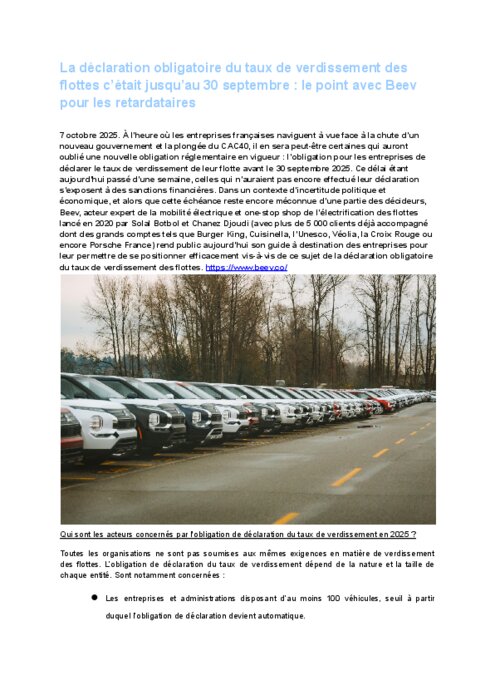 À l’heure où les entreprises françaises naviguent à vue face à la chute d’un nouveau gouvernement et la plongée du CAC40, il en sera peut-être certaines qui auront oublié une nouvelle obligation réglementaire en vigueur : l’obligation pour les entreprises de déclarer le taux de verdissement de leur flotte avant le 30 septembre 2025. Ce délai étant aujourd’hui passé d’une semaine, celles qui n’auraient pas encore effectué leur déclaration s’exposent à des sanctions financières. Dans un contexte d’incertitude politique et économique, et alors que cette échéance reste encore méconnue d’une partie des décideurs, Beev, acteur expert de la mobilité électrique et one-stop shop de l’électrification des flottes lancé en 2020 par Solal Botbol et Chanez Djoudi (avec plus de 5 000 clients déjà accompagné dont des grands comptes tels que Burger King, Cuisinella, l’Unesco, Véolia, la Croix Rouge ou encore Porsche France) rend public aujourd’hui son guide à destination des entreprises pour leur permettre de se positionner efficacement vis-à-vis de ce sujet de la déclaration obligatoire du taux de verdissement des flottes.