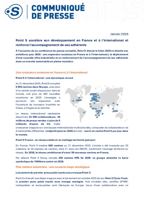 À l’occasion de sa conférence de presse annuelle, Point S dresse le bilan 2025 et dévoile ses ambitions pour 2026 : une expansion soutenue en France et à l’international, le déploiement d’une nouvelle offre industrielle et un renforcement de l’accompagnement de ses adhérents dans un marché automobile en pleine mutation.