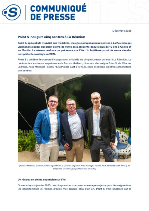 Point S, spécialiste mondial des mobilités, inaugure cinq nouveaux centres à La Réunionqui viennent s’ajouter aux deux points de vente déjà présents depuis plus de 10 ans à Cilaos et au Moufia. Le réseau renforce sa présence sur l’île. Un huitième point de vente viendra compléter le maillage en 2026.