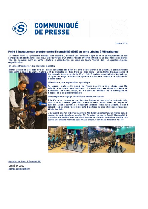 Le réseau Point S, spécialiste mondial des mobilités, franchit une nouvelle étape dans le développement de son concept Écomobilité, lancé en 2022, avec l’ouverture d’un premier centre entièrement dédié aux deux-roues en cœur de ville. Ce nouveau point de vente s’installe à Villeurbanne, au cœur du Cours Tolstoï, dans un quartier en pleine requalification.