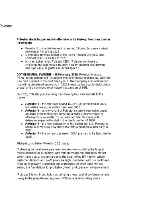 Polestar (Nasdaq : PSNY) a annoncé aujourd'hui la plus grande offensive de modèles de son histoire, avec quatre nouvelles voitures prévues au cours des trois prochaines années. La société a également annoncé qu'avec une approche rigoureuse, elle prévoit pour 2026 une croissance à deux chiffres de son volume et une expansion continue de son réseau de vente au détail de 30 %.