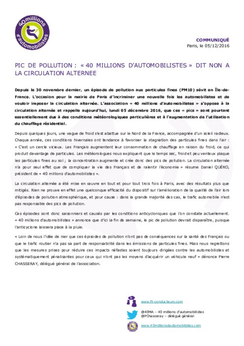 Depuis le 30 novembre dernier, un épisode de pollution aux particules fines (PM10) sévit en Île-de-France. L'occasion pour la mairie de Paris d'incriminer une nouvelle fois les automobilistes et de vouloir imposer la circulation alternée. L'association « 40 millions d'automobilistes » s'oppose à la circulation alternée et rappelle, lundi 05 décembre 2016, que ces «pics» sont pourtant essentiellement dus à des conditions météorologiques particulières et à l'augmentation du chauffage résidentiel.