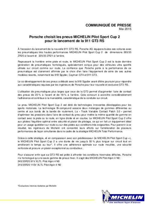 À l'occasion du lancement de la nouvelle 911 GT3 RS, Porsche AG équipera toutes ses voitures avec les pneumatiques très hautes performances MICHELIN Pilot Sport Cup 2 de dimensions 265/35 ZR20 à l'avant et 325/30 ZR21 à l'arrière. Repoussant la frontière entre piste et route, le MICHELIN Pilot Sport Cup 2 est la toute dernière génération de pneumatiques homologués, spécialement conçus pour des véhicules ultra sportifs utilisés sur circuit comme sur route.