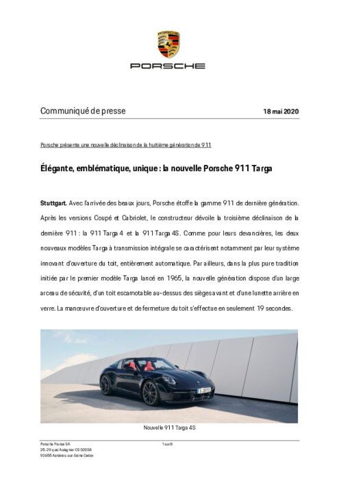 Avec l'arrivée des beaux jours, Porsche étoffe la gamme 911 de dernière génération. Après les versions Coupé et Cabriolet, le constructeur dévoile la troisième déclinaison de la dernière 911 : la 911 Targa 4 et la 911 Targa 4S. Comme pour leurs devancières, les deux nouveaux modèles Targa à transmission intégrale se caractérisent notamment par leur système innovant d'ouverture du toit, entièrement automatique...
