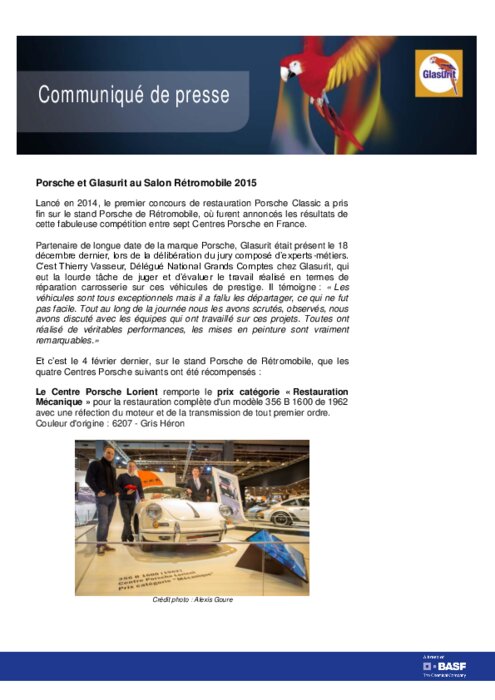 Equipementiers 13 février 2015 - 11:13 Lancé en 2014, le premier concours de restauration Porsche Classic a pris fin sur le stand Porsche de Rétromobile, où furent annoncés les résultats de cette fabuleuse compétition entre sept Centres Porsche en France. PDF (489 Ko) Télécharger