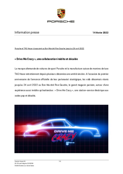 Installé au rez-de-chaussée de l’historique magasin parisien, vous ne trouverez aucun effluve d’essence dans l’espace « Drive Me Crazy » mais un lieu expérientiel et lifestyle revisitant les codes de la station-service... en version électrique. Depuis l’entrée par les immenses rouleaux inspirés des « car wash » jusqu’aux vitrines reprenant le design des pompes à essence vintage, la scénographie a été pensée pour offrir aux visiteurs une expérience immersive, mémorable et surprenante. Durant toute la durée de l’évènement, une programmation riche, créative et émotionnelle, sera proposée pour permettre à toute la famille d’explorer les univers de Porsche et de TAG Heuer à travers leur passion commune pour le sport automobile, le design et le luxe.