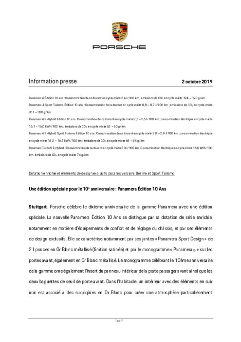 Porsche célèbre le dixième anniversaire de la gamme Panamera avec une édition spéciale. La nouvelle Panamera Édition 10 Ans se distingue par sa dotation de série enrichie, notamment en matière d'équipements de confort et de réglage du châssis, et par ses éléments de design exclusifs. Elle se caractérise notamment par ses jantes "Panamera Sport Design" de 21 pouces en Or Blanc métallisé (finition satinée) et par le monogramme "Panamera-10" sur les portes avant, également en Or Blanc métalisé.