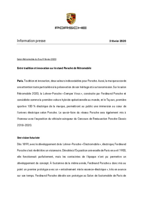 Tradition et innovation, deux valeurs indissociables pour Porsche. Aussi, la marque accorde une attention toute particulière à la préservation de son héritage et à sa transmission. Sur le salon Rétromobile 2020, la Lohner-Porsche «Semper Vivus», construite par Ferdinand Porsche et considérée comme la première voiture hybride opérationnelle au monde, et le Taycan, première sportive 100% électrique de la marque, permettront au public une immersion au cœur de l'univers électrique selon Porsche.