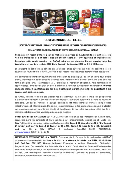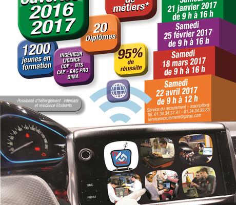 Constatant un regain d’intérêt pour les métiers des services de l’Automobile, de la Moto et du Véhicule industriel et la Mobilité avec un effectif record de 1 200 apprentis et ingénieurs en formation cette année scolaire, le GARAC débutera ses Journées Portes ouvertes pour les inscriptions en vue de la rentrée 2017 dès le Samedi 10 décembre 2016 de 9 H à 12 Heures.