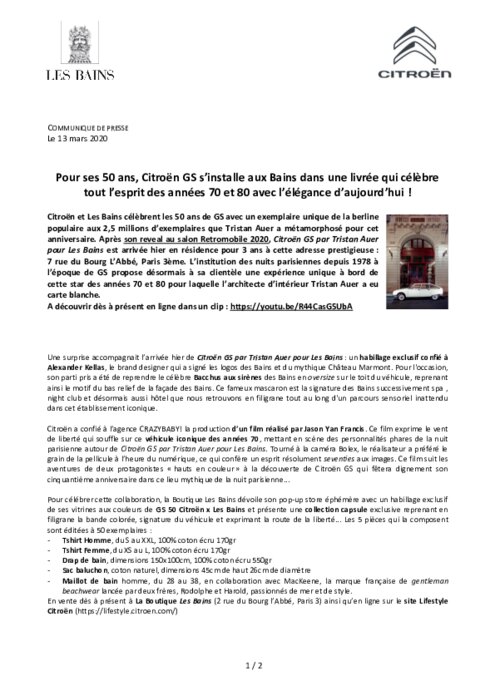 Citroën et Les Bains célèbrent les 50 ans de GS avec un exemplaire unique de la berline populaire aux 2,5 millions d'exemplaires que Tristan Auer a métamorphosé pour cet anniversaire. Après son reveal au salon Retromobile 2020, Citroën GS par Tristan Auer pour Les Bains est arrivée hier en résidence pour 3 ans à cette adresse prestigieuse : 7 rue du Bourg L'Abbé, Paris 3ème...