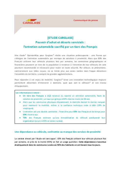 Une étude OpinionWay pour Carglass révèle une situation préoccupante : une France qui s'éloigne de l’entretien automobile par manque de solutions à proximité. Alors que 83% des Français utilisent leur véhicule plusieurs fois par semaine, les contraintes géographiques et financières poussent un tiers de la population à renoncer à l’entretien de leur véhicule. Un acte pourtant recommandé et nécessaire pour rouler en toute sécurité. Par ailleurs, ce phénomène, contrairement aux idées reçues, ne se limite plus aux zones isolées mais frappe désormais l’ensemble du territoire, y compris les grandes agglomérations.