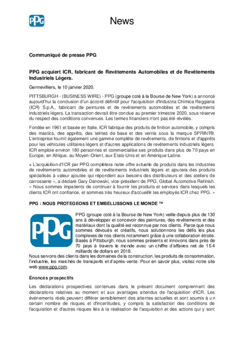 PPG (groupe coté à la Bourse de New York) a annoncé la conclusion d'un accord définitif pour l'acquisition d'Industria Chimica Reggiana (ICR) S.p.A., fabricant de peintures et de revêtements automobiles et de revêtements industriels légers. La transaction devrait être conclue au premier trimestre 2020, sous réserve du respect des conditions convenues. Les termes financiers n'ont pas été révélés.