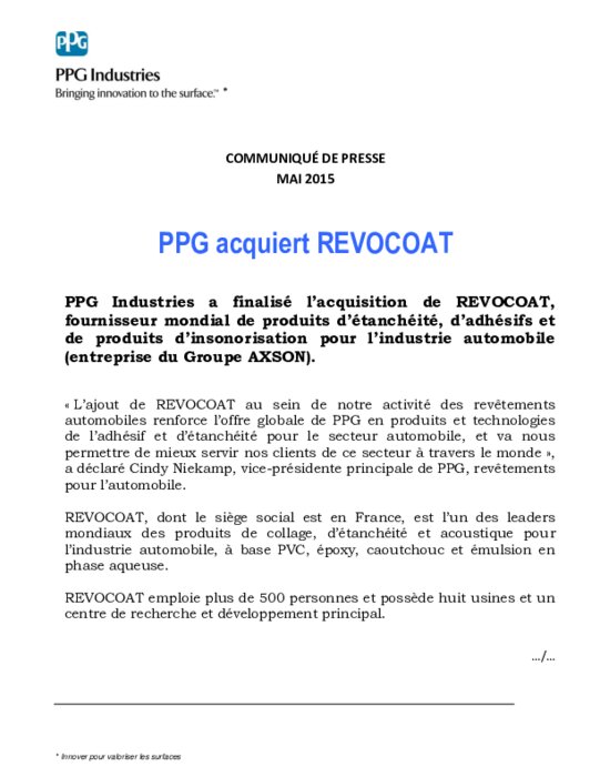 PPG Industries a finalisé l’acquisition de REVOCOAT, fournisseur mondial de produits d’étanchéité, d’adhésifs et de produits d’insonorisation pour l’industrie automobile (entreprise du Groupe AXSON).