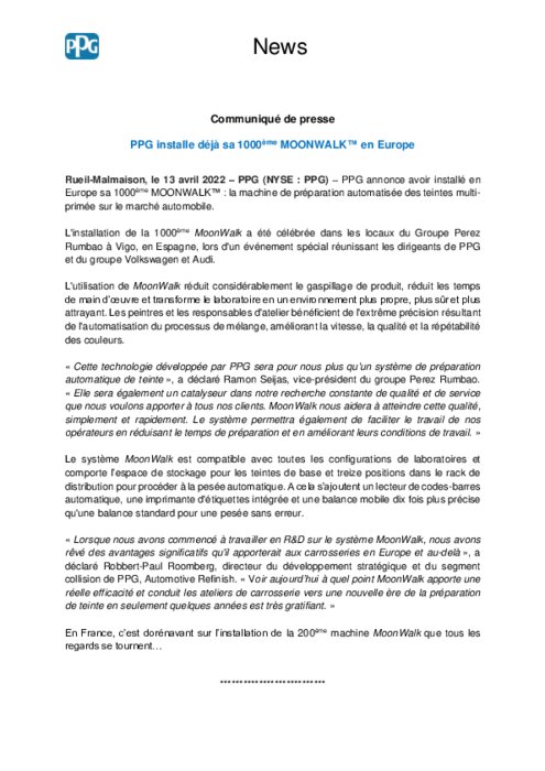 PPG annonce avoir installé en Europe sa 1000ème MOONWALK : la machine de préparation automatisée des teintes multiprimée sur le marché automobile. L'installation de la 1000ème MoonWalk a été célébrée dans les locaux du Groupe Perez Rumbao à Vigo, en Espagne, lors d'un événement spécial réunissant les dirigeants de PPG et du groupe Volkswagen et Audi.