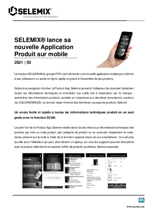 La marque SELEMIX du groupe PPG vient de lancer une nouvelle application mobile pour donner à ses utilisateurs un accès en ligne rapide et gratuit à l'ensemble de ses produits. Grâce à sa navigation intuitive, la Product App Selemix permet à l’utilisateur de consulter facilement toutes les informations techniques et d’accéder aux outils mis à disposition par la marque : rechercher des informations produits, accéder en instantané aux dernières formulations couleurs via COLORMOBILE...