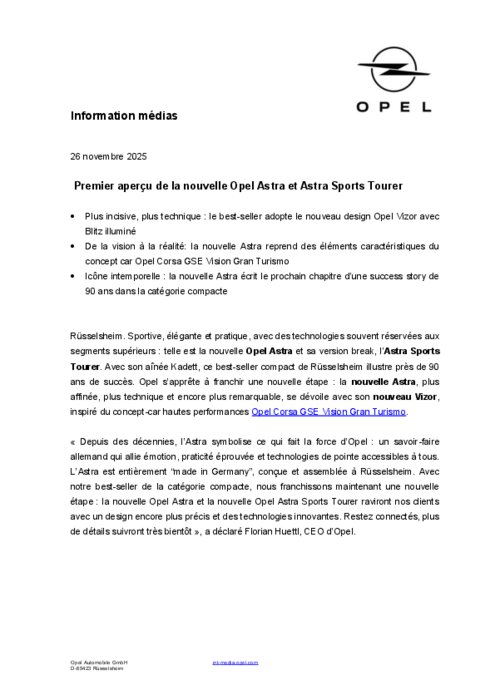 Sportive, élégante et pratique, avec des technologies souvent réservées aux segments supérieurs : telle est la nouvelle Opel Astra et sa version break, l’Astra Sports Tourer. Avec son aînée Kadett, ce best-seller compact de Rüsselsheim illustre près de 90 ans de succès. Opel s’apprête à franchir une nouvelle étape : la nouvelle Astra, plus affinée, plus technique et encore plus remarquable, se dévoile avec son nouveau Vizor, inspiré du concept-car hautes performances Opel Corsa GSE Vision Gran Turismo.