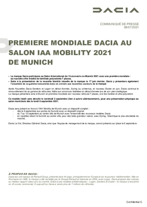 La marque Dacia participera au Salon International de l’Automobile de Munich 2021 avec une première mondiale : sa nouvelle offre inédite de familiale polyvalente 7 places.