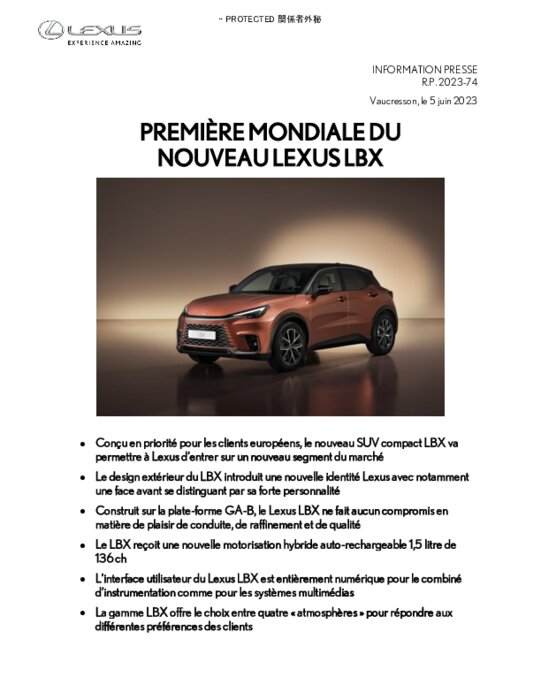 Conçu en priorité pour les clients européens, le nouveau SUV compact LBX va permettre à Lexus d’entrer sur un nouveau segment du marché. Le design extérieur du LBX introduit une nouvelle identité Lexus avec notamment une face avant se distinguant par sa forte personnalité. Le LBX reçoit une nouvelle motorisation hybride auto-rechargeable 1,5 litre de 136 ch.