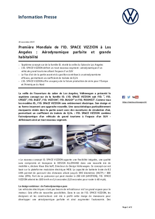 La veille de l’ouverture du salon de Los Angeles, Volkswagen a présenté le septième concept-car de la famille ID. L’ID. SPACE VIZZION suit l’ID., l’ID. CROZZ, l’ID. BUZZ, l’ID. VIZZION, l’ID. BUGGY et l’ID. ROOMZZ. Comme tous les modèles ID., l’ID. SPACE VIZZION sera entièrement électrique. Son design et sa forme incarnent une approche nouvelle. Une caractéristique particulièrement marquante réside dans la partie avant avec des ouvertures de circulation d’air...