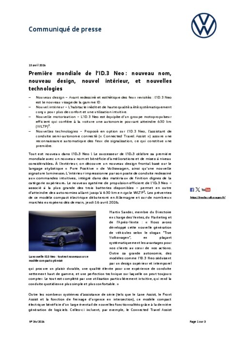 Tout est nouveau dans l'ID.3 Neo ! Le successeur de l'ID.3 célèbre sa première mondiale avec un nouveau nom et bénéficie d'améliorations et de mises à niveau considérables. À l'extérieur, on découvre un nouveau design frontal basé sur le langage stylistique « Pure Positive » de Volkswagen, ainsi qu'une nouvelle signature lumineuse. L'intérieur impressionne par son poste de conduite redessiné aux commandes intuitives, intégré dans des matériaux de finition dignes de la catégorie supérieure. Le nouveau système de propulsion efficient de l'ID.3 Neo – associé à la plus grande des trois batteries disponibles – permet en outre d'atteindre des autonomies allant jusqu'à 630 km en cycle WLTP2. Les préventes de ce modèle compact électrique débuteront en Allemagne et sur de nombreux marchés européens dès demain, jeudi 16 avril 2026.