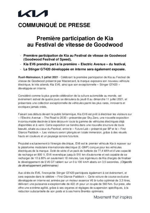 Célébrant la première participation de Kia au Festival de vitesse de Goodwood présenté par Mastercard, la marque exposera son nouveau véhicule électrique, le très attendu Kia EV6, ainsi que son exceptionnelle « Stinger GT420 » développée en interne.