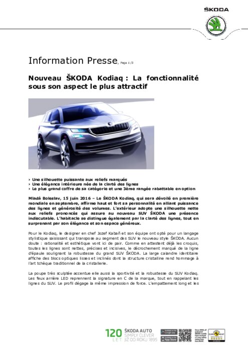 Le ŠKODA Kodiaq, qui sera dévoilé en première mondiale en septembre, affirme haut et fort sa personnalité en alliant puissance des lignes et générosité des volumes. L’extérieur adopte une silhouette nette aux reliefs prononcés qui assure au nouveau SUV ŠKODA une présence indiscutable. L’habitacle se distingue également par la clarté des lignes, tout en surprenant par son élégance et son espace généreux.
