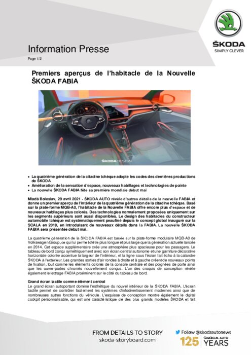 ŠKODA AUTO révèle d'autres détails de la nouvelle FABIA et donne un premier aperçu de l'intérieur de la quatrième génération de la citadine tchèque. Basé sur la plate-forme MQB-A0, l’habitacle de la Nouvelle FABIA offre encore plus d’espace et de nouveaux habilages plus colorés. Des technologies normalement proposées uniquement sur les segments supérieurs sont aussi disponibles. Le design des habitacles du constructeur automobile tchèque est systématiquement peaufiné...