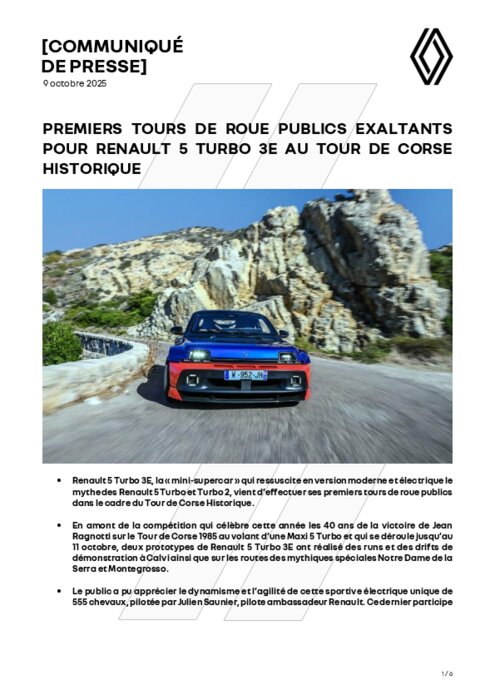 Constructeurs 09 octobre 2025 - 11:20 Renault 5 Turbo 3E, la « mini-supercar » qui ressuscite en version moderne et électrique le mythe des Renault 5 Turbo et Turbo 2, vient d’effectuer ses premiers tours de roue publics dans le cadre du Tour de Corse Historique. PDF (950 Ko) Télécharger Crédit photo : Renault