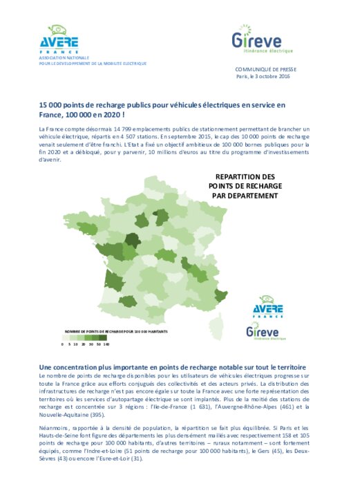La France compte désormais 14 799 emplacements publics de stationnement permettant de brancher un véhicule électrique, répartis en 4 507 stations. En septembre 2015, le cap des 10 000 points de recharge venait seulement d'être franchi. L'état a fixé un objectif ambitieux de 100 000 bornes publiques pour la fin 2020 et a débloqué, pour y parvenir, 10 millions d'euros au titre du programme d'investissements d’avenir.
