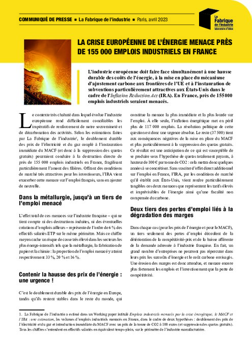 Selon les estimations de La Fabrique de l'industrie, en France, près de 155 000 emplois industriels seraient directement menacés par l'inflation énergétique et la mise en place du MACF (Mécanisme d'ajustement carbone aux frontières). Sans effet additionnel direct sur l'emploi, l'IRA vient exacerber cette menace par les conditions de marché attractives qu'il offre aux investisseurs.